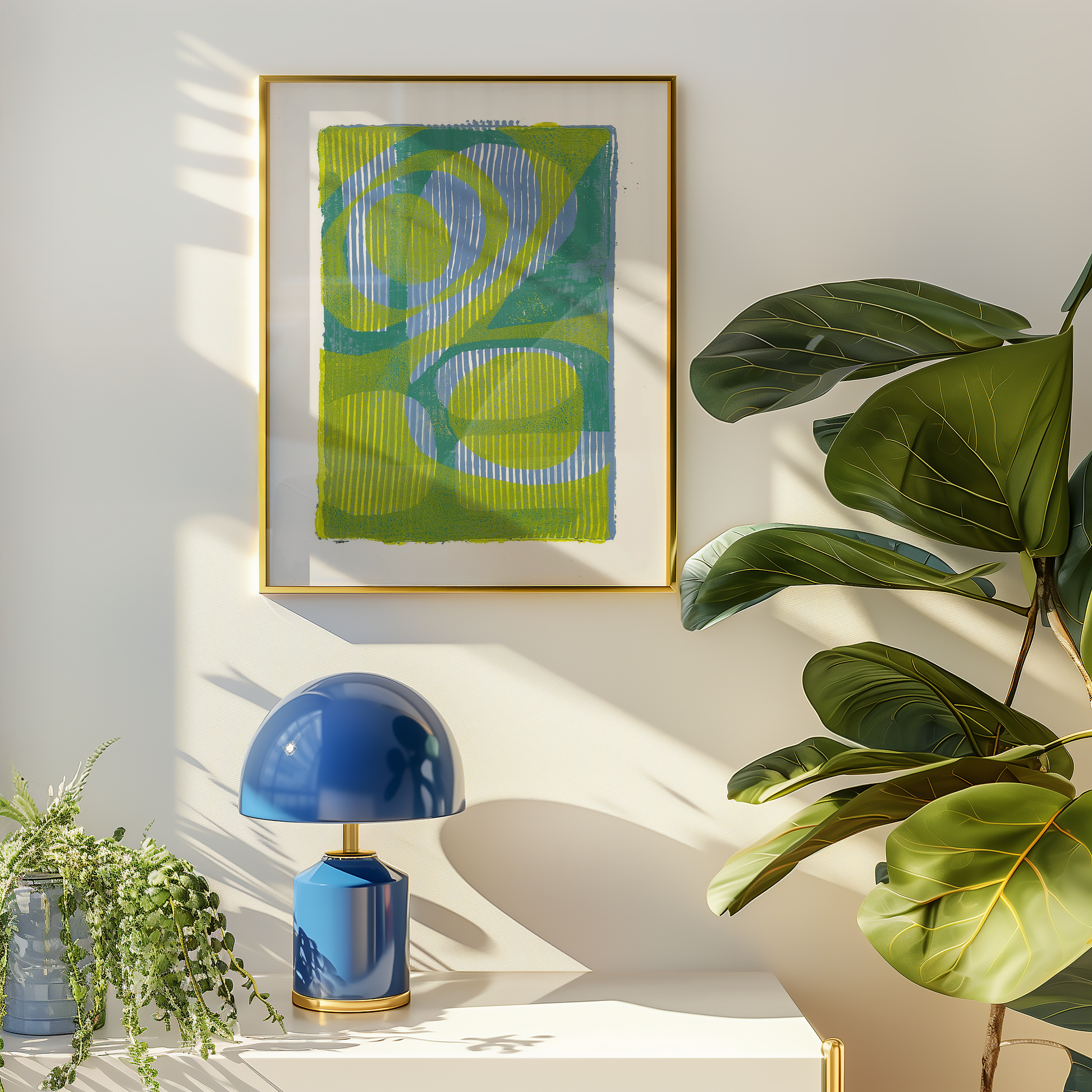 This Gelli Art Print features a striking arrangement of teal and green graphic shapes. The bold geometric forms and layered textures create a sense of depth and modern energy, making it a captivating statement piece for contemporary interiors.